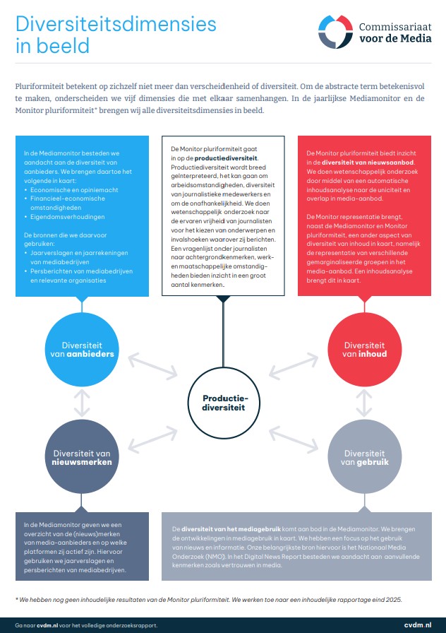 De Mediamonitor geeft inzicht in ontwikkelingen op het gebied van pluriformiteit van het media-aanbod in het algemeen en de informatievoorziening in het bijzonder. Pluriformiteit betekent op zichzelf niet meer dan verscheidenheid of diversiteit. Om de abstracte term betekenisvol te maken, onderscheiden we vijf dimensies die met elkaar samenhangen. In de jaarlijkse Mediamonitor brengen wij drie diversiteitsdimensies in beeld, namelijk diversiteit van aanbieders, aanbod (nieuwsmerken) en gebruik. Met de Monitor Pluriformiteit zullen we de jaarlijkse monitoring uitbreiden naar alle vijf diversiteitsdimensies. Lees daarover meer in de opzet voor de Monitor Pluriformiteit.