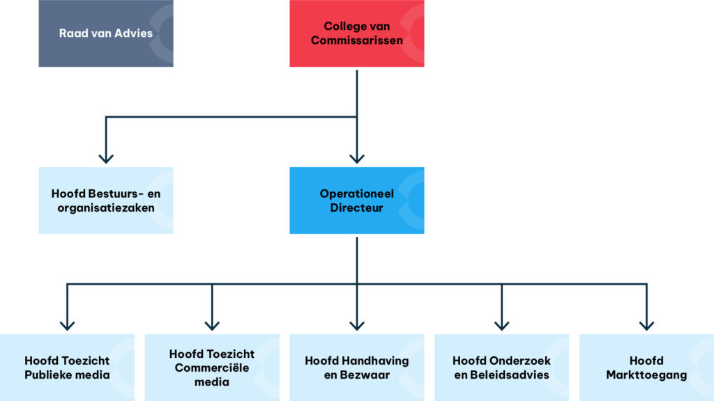 Het Commissariaat voor de Media werkt vanuit de afdelingen Markttoegang, Toezicht, Handhaving en Bezwaar, Onderzoek en Beleidsadvies en Bestuurs- en Organisatiezaken.